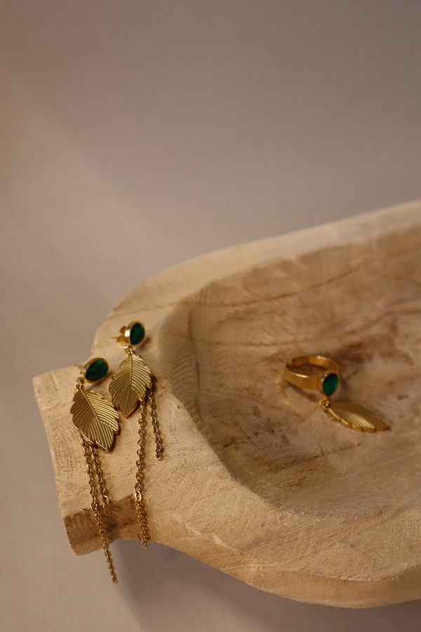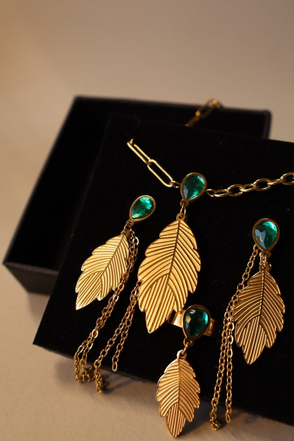 O conjunto inclui um par de brincos dourados,